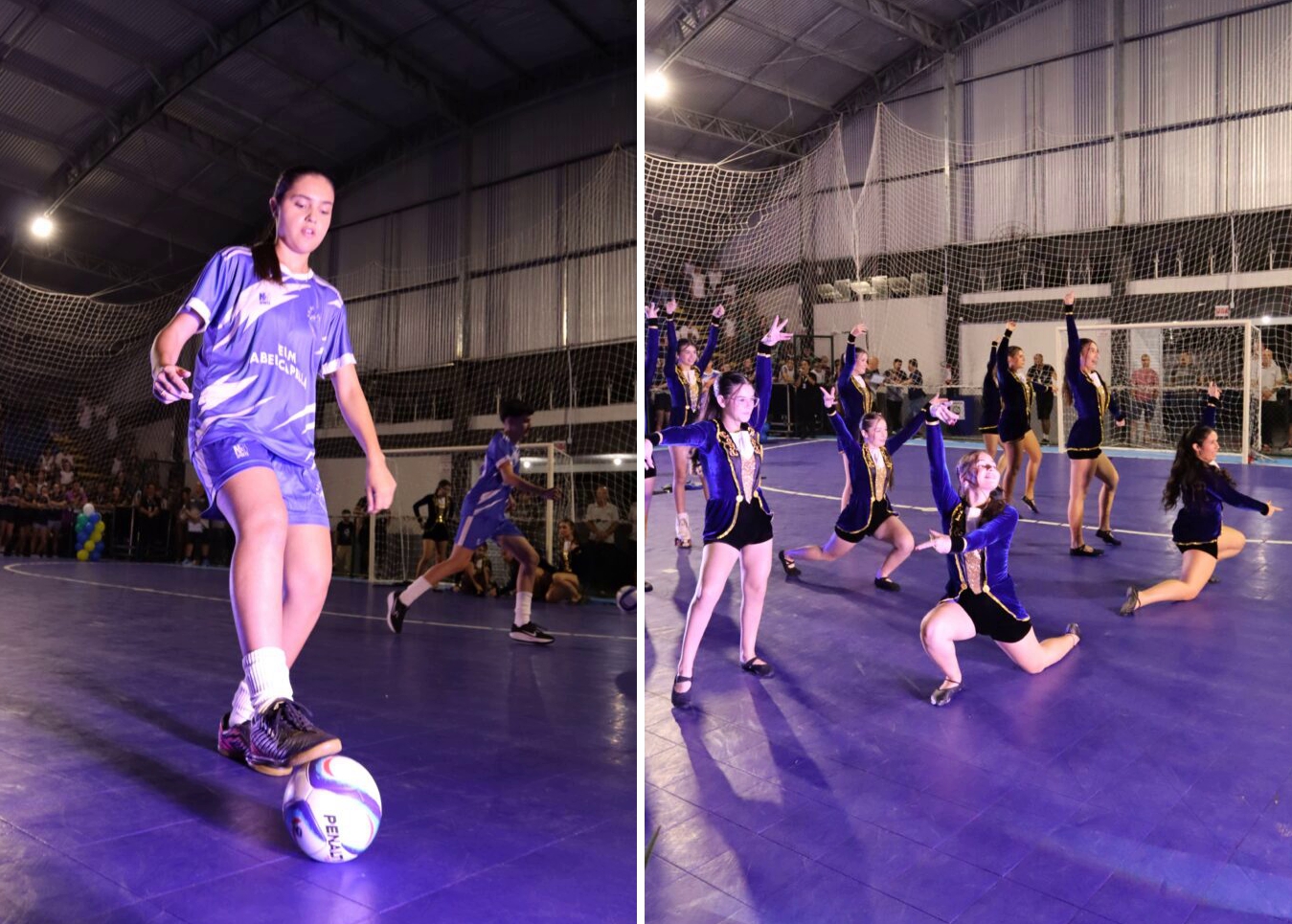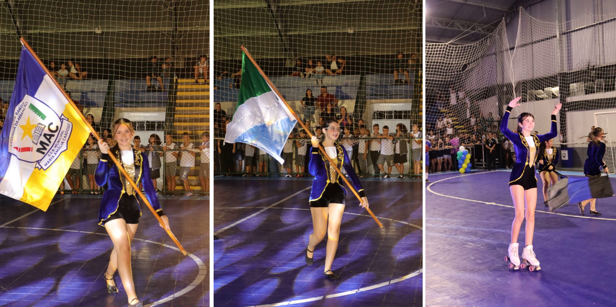 Depois dos discursos de boas-vindas das autoridades, a solenidade seguiu com apresentações em quadra, que foram a grande surpresa da noite, com coreografias que mesclaram referências ao universo dos esportes olímpicos e à patinação artística. Outro momento de destaque ficou por conta da entrada das delegações representantes das escolas. Alunos uniformizados desfilaram simulando a chegada dos atletas à arena olímpica, o que conferiu um tom cerimonial e simbólico ao evento.