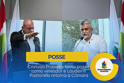 Na sessão ordinária realizada na terça-feira (14), o presidente da Câmara Municipal de Biguaçu, vereador João Luiz Luz, deu posse ao primeiro suplente do Podemos, Cristyan Silveira Prazeres. Ele passa a ocupar a vaga deixada pelo vereador licenciado Israel Gaspar, que se afastou do Legislativo para assumir a Secretaria Municipal de Desenvolvimento Econômico e Inovação.